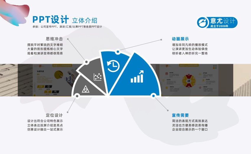 蘇州意尤文化傳播有限公司是一家有著多年廣告設(shè)計(jì)經(jīng)驗(yàn)的蘇州知名廣告企業(yè) 主要業(yè)務(wù)有蘇州PPT設(shè)計(jì)、蘇州產(chǎn)品PPT設(shè)計(jì)、蘇州企業(yè)PPT設(shè)計(jì)、蘇州會(huì)議PPT設(shè)計(jì)、蘇州項(xiàng)目PPT設(shè)計(jì)、企業(yè)VI設(shè)計(jì)、設(shè)計(jì)印刷宣傳冊(cè)/樣本/單頁/名片等 自2007年成立以來,蘇州意尤廣告公司與蘇州及蘇州各市的幾百家中外企業(yè)進(jìn)行了廣告設(shè)計(jì)合作,經(jīng)過多年發(fā)展公司已形成了以企業(yè)PPT設(shè)計(jì)、企業(yè)VI設(shè)計(jì),廣告設(shè)計(jì),廣告印刷,樣本設(shè)計(jì),宣傳冊(cè)設(shè)計(jì),名片印刷,菜譜制作,單頁,宣傳單等一批特長業(yè)務(wù),相信在各位新老客戶的關(guān)心下,本公司會(huì)得到更大的發(fā)展,同時(shí)為客戶的發(fā)展宣傳保駕護(hù)航。